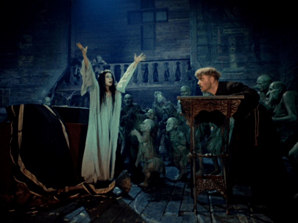 O verdadeiro horror, no entanto, começa quando Khoma é convocado por um poderoso cossaco para velar por três noites o corpo de sua filha — a mesma bruxa transfigurada — que, em seu último suspiro, exigiu a presença do jovem teólogo. A partir daí, Viy entra em sua fase mais gótica: uma igreja abandonada, um corpo inerte que se ergue, monstros noturnos, exorcismos com giz e círculos mágicos traçados com mãos trêmulas. Cada noite intensifica a tensão, evocando The Monk, de Lewis, e os contos de E.T.A. Hoffmann.