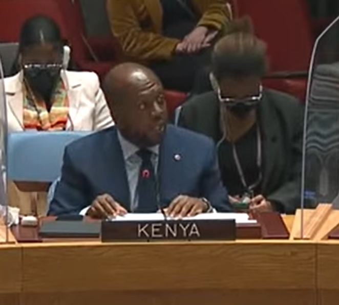 Rejeitamos o irredentismo e o expansionismo em qualquer base, incluindo fatores raciais, étnicos, religiosos ou culturais. Nós o rejeitamos novamente hoje. O Quênia registra sua forte preocupação e oposição ao reconhecimento de Donetsk e Luhansk como estados independentes. Além disso, condenamos veementemente a tendência nas últimas décadas de Estados poderosos, incluindo membros deste Conselho de Segurança, violarem o direito internacional com desprezo.