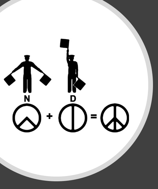 Holtom projetou o símbolo para uso na primeira manifestação em massa do CND contra armas nucleares em 1958, que ocorreu em Trafalgar Square, em Londres. O símbolo é baseado nos sinais do semáforo. O alfabeto semáforo surgiu nos meados do século XIX para ajudar a comunicação entre barcos e autoridades portuárias. São sinais para as letras “N” e “D”, significando “desarmamento nuclear” (Nuclear Disarmament). Desde então, o desenho foi interpretado como uma combinação das letras “C” e “ND”, representando “Campanha pelo Desarmamento Nuclear”.
