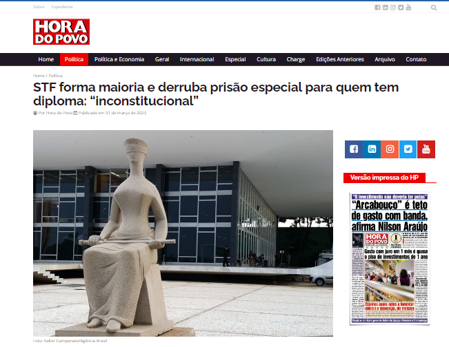 A reportagem do Hora do Povo publicada em 31 de março de 2023, com a manchete STF forma maioria e derruba prisão especial para quem tem diploma: “inconstitucional”, nos menciona.