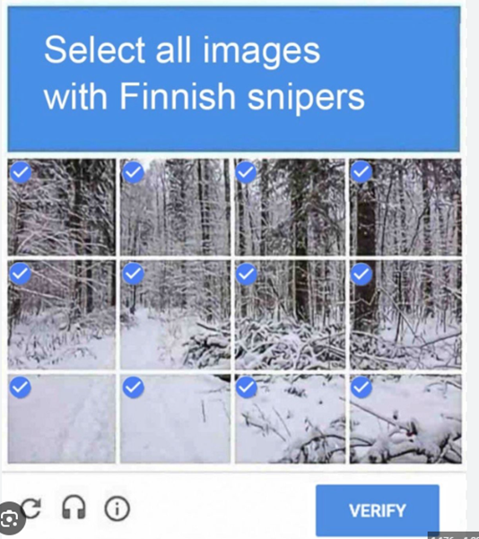 Me: I am shown six images. They all depict a forest with heavy snow, everything looks covered in white. I’m asked to select the images that have a Finnish sniper on them. I select all the six images. What’s the joke?