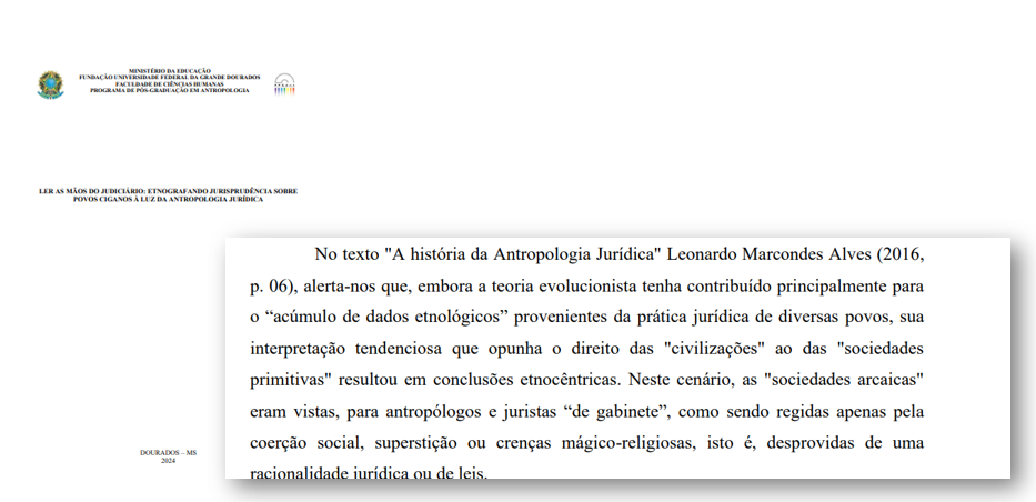 GARCIA, Luciana de Assiz. Ler as mãos do judiciário: etnografando jurisprudência sobre povos ciganos à luz da antropologia jurídica. 2024. 204 f. Dissertação (Mestrado em Antropologia) – Faculdade de Ciências Humanas, Universidade Federal da Grande Dourados, Dourados, MS, 2024. Disponível em: http://repositorio.ufgd.edu.br/jspui/handle/prefix/6111