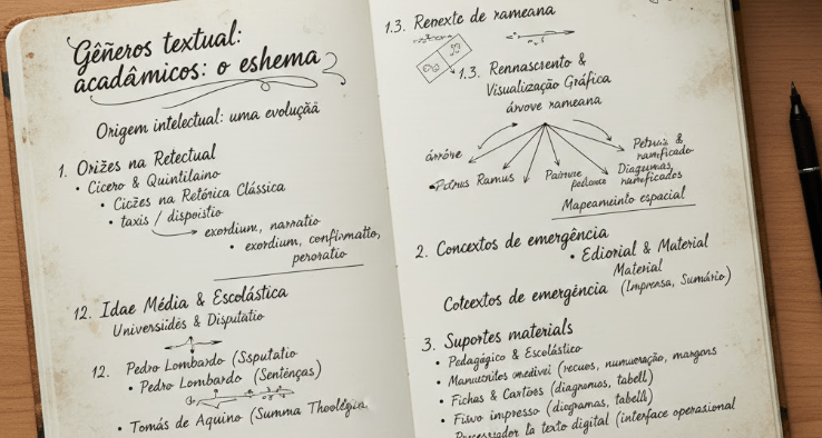 O esboço esquemático, hoje conhecido sobretudo pelo termo inglês outline, é um gênero intelectual que emergiu de práticas sucessivas de ordenação do pensamento, desenvolvidas em diferentes contextos históricos, pedagógicos e materiais. Sua função central sempre foi a mesma: intermediar o percurso entre a ideia dispersa e a forma acabada do discurso.
